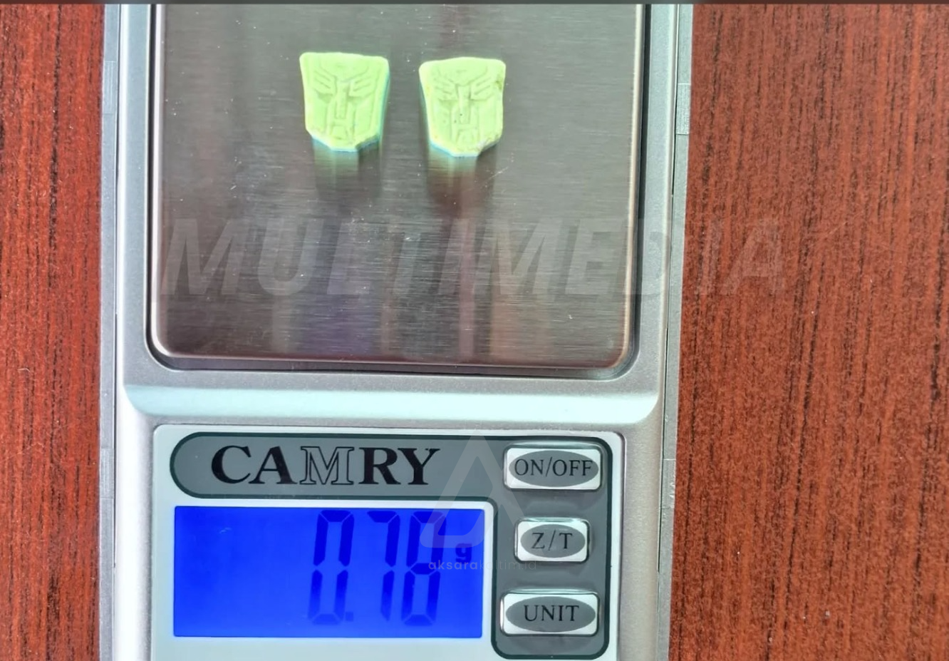 Setelah diperiksa, bungkusan tersebut berisi plastik klip bening yang memuat 2 butir pil ekstasi merk transformer warna hijau–biru dengan berat 0,78 gram netto.