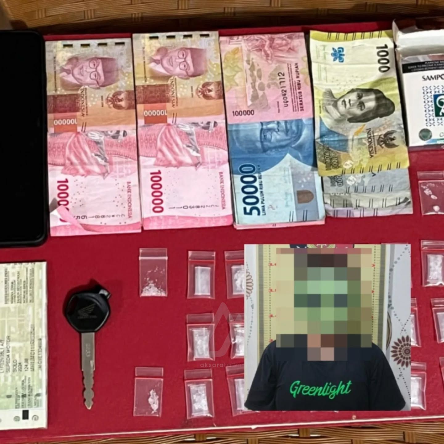 Petugas langsung melakukan pemeriksaan dan menemukan bungkus rokok berisi puluhan paket sabu. Selain sabu, turut diamankan barang bukti lain berupa sepeda motor, kunci kontak, ponsel, STNK, serta uang tunai lebih dari Rp3 juta yang diduga hasil penjualan barang haram tersebut.