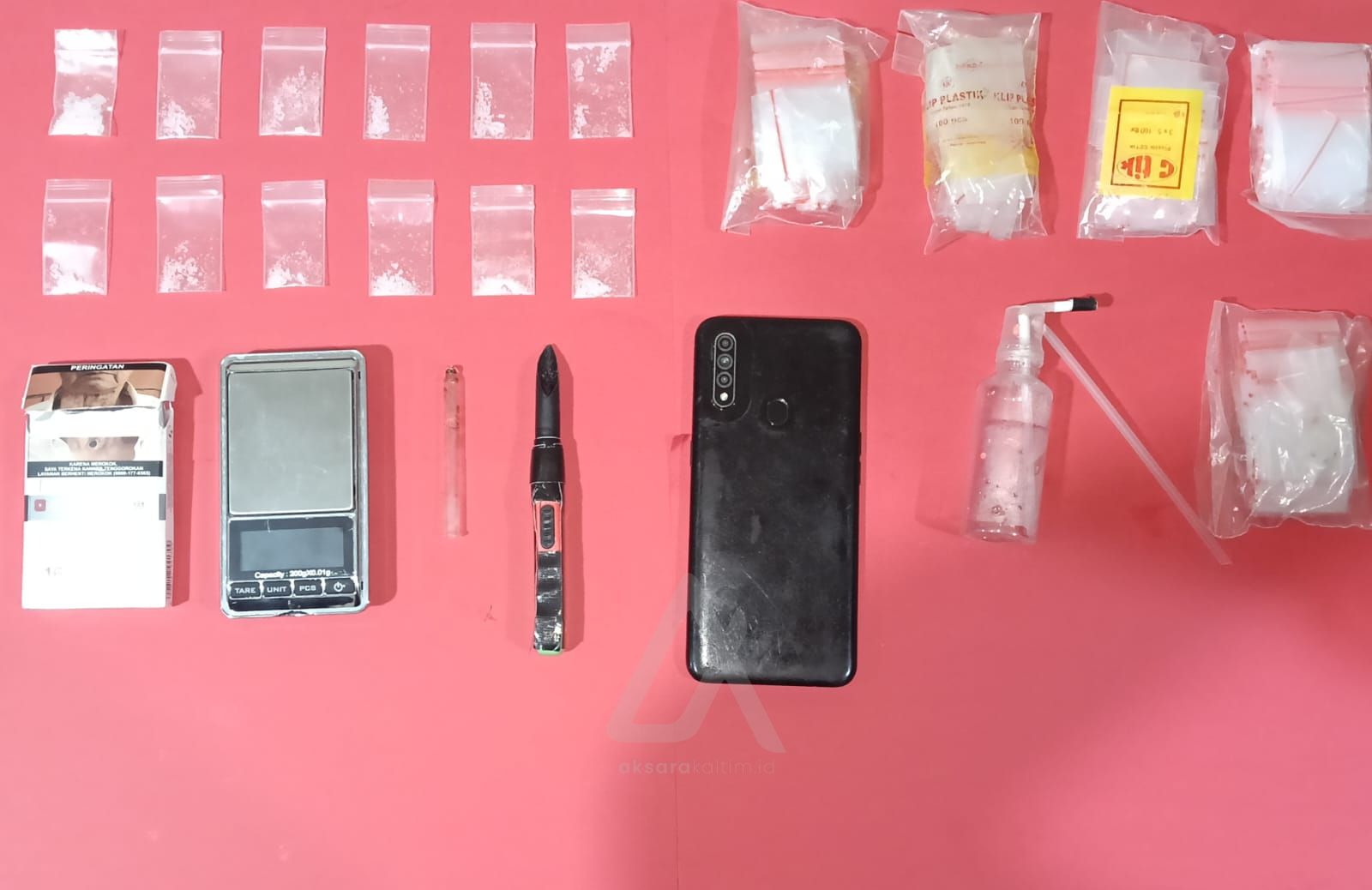 Selain itu polisi juga mendapati timbangan digital, alat hisap, pipet kaca, sedotan runcing, kotak rokok, serta satu unit handphone yang diduga digunakan sebagai sarana transaksi.